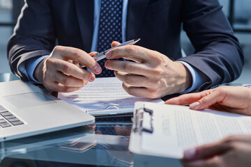 Closeup of candidate signing application form. Business person sitting at desk. Recruitment concept. Cropped front view.