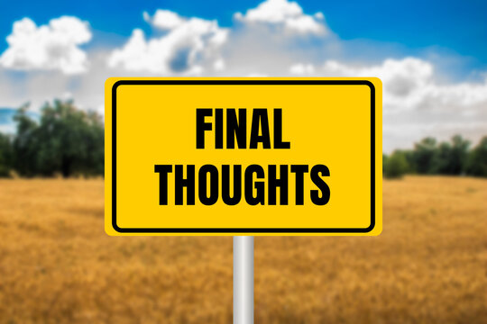 Final thoughts message written on yellow metal sign on blurry wheat field background. Conceptual final thoughts symbol. Copy space.