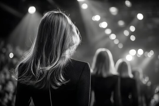A fashion show finale scene, featuring a model confidently walking down the catwalk runway. The event is vibrant, with spotlights illuminating the model, showcasing the latest fashion trends in a styl