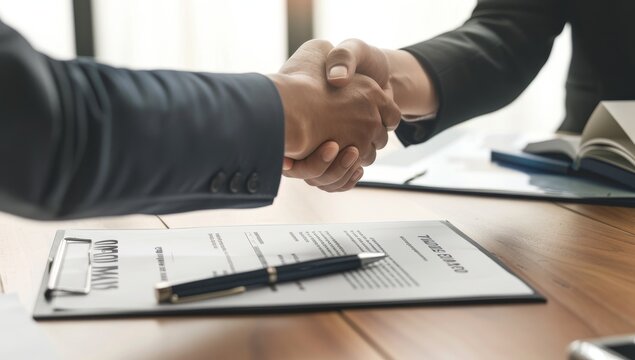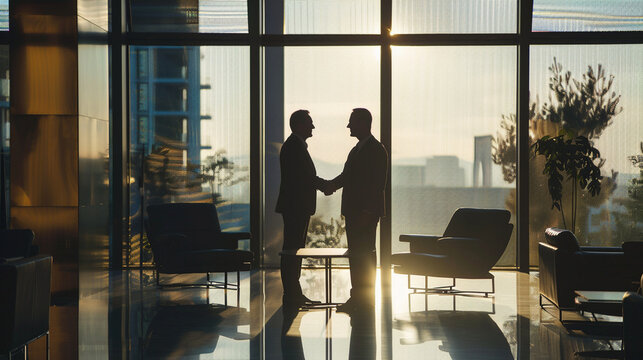 In the serene setting of a conference room, two businessmen share a handshake, their eyes meeting with determination and respect as they finalize a deal that promises mutual succes