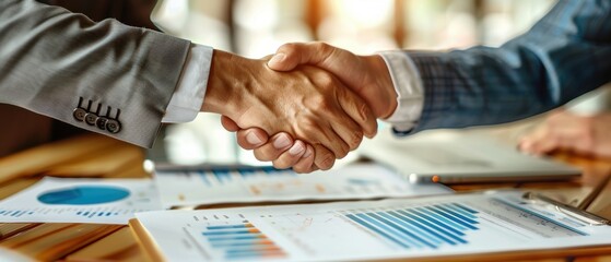 A pair of business partners shaking hands over a finalized financial plan, documents and charts visible