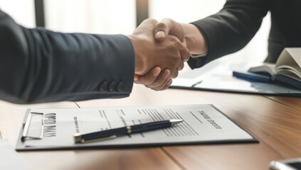 Real estate agent shaking hands with their client after finalizing the home's title. Sale or house move. On top of the table is a document with a written description of a house