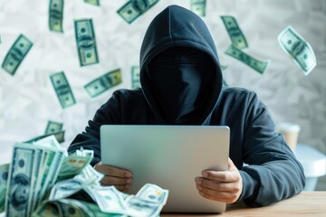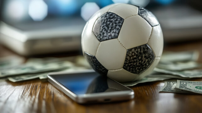 A soccer ball resting on a wooden table alongside a smartphone and scattered US dollar bills, illustrating sports and finance themes.