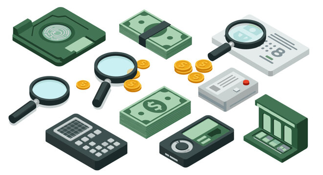 Isometric financial audit tools and currency symbols for business analysis