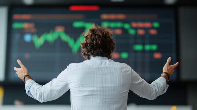 A person observes financial charts on a large screen, reacting with a raised hands gesture, suggesting surprise or frustration in a trading environment.