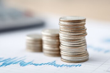 Stacks of coins on a financial chart background, symbolizing investment and growth.