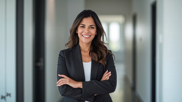 Sonriente gerente, abogada o consultora de pie en el interior de un edificio corporativo con fondo desenfocado. Imagen de una empleada ambiciosa y amigable lista para el éxito y el crecimiento laboral