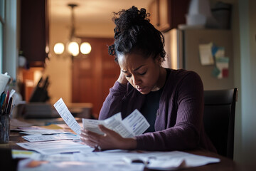 A single mother sitting at her kitchen table, surrounded by past-due bills and foreclosure notices, looking overwhelmed by bankruptcy and financial hardship