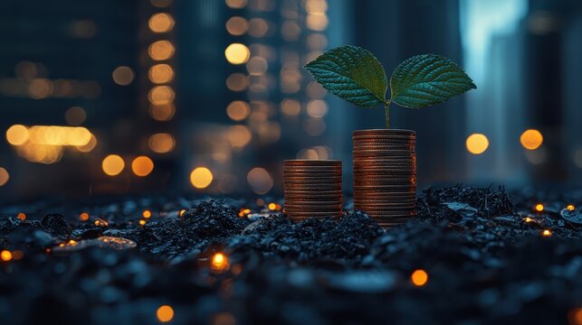 A row of stacks of coins, their surfaces adorned with vibrant emerald leaves, symbolizing growth and prosperity, a testament to the enduring power of financial discipline and the potential for