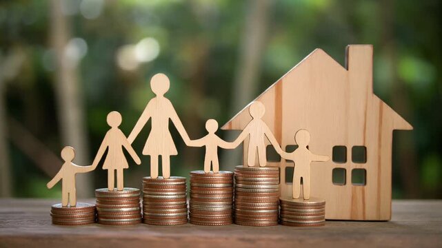 Two wooden figures standing on stacks of coins, symbolizing financial growth or savings.