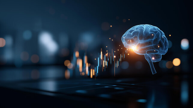 Digital brain hologram visualizing financial data candlestick charts display futuristic fintech concept investment analysis visualization artificial intelligence