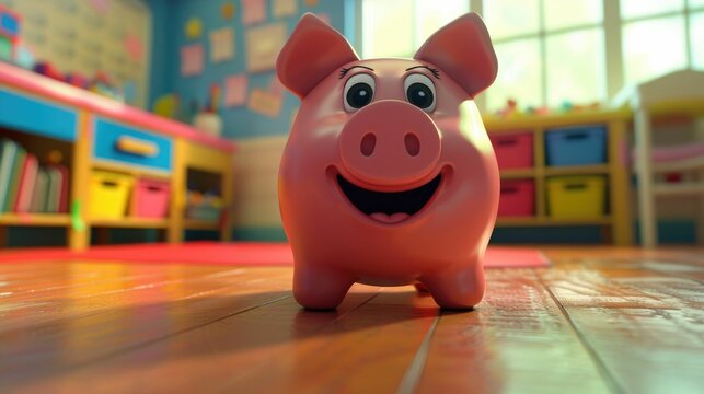 An animated piggy bank for teaching children the basics of financial education, in a colorful classroom setting
