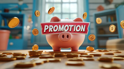 cartoonish 3D piggy bank surrounded by coins, emphasizing promotion theme. vibrant colors and playful design create engaging visual for savings and financial growth