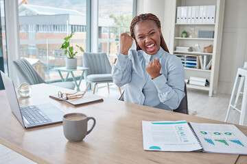 Cheering, celebrating and successful business analyst excited after analyzing laptop data, paperwork chart and profit report. Portrait of smiling, happy and winning woman with company growth mindset