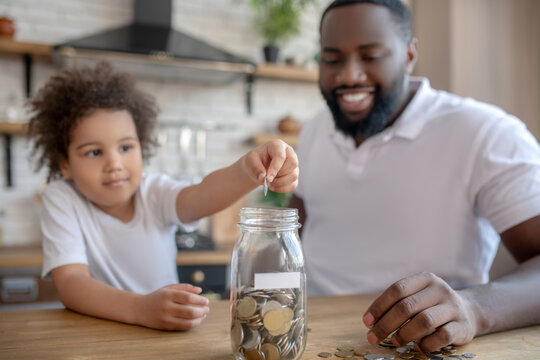 businessman putting coin on the piggybank and paper family on table, donation, saving, charity, family finance plan concept, fundraising, superannuation, investment, financial crisis concept.