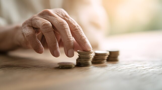Coins and a calculator on a wooden desk with sunlight, depicting financial serenity