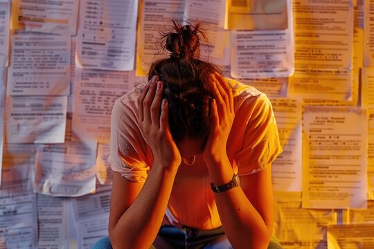 A person sitting with their head in their hands, surrounded by debt notices on a solid background, emphasizing the emotional toll of financial stress
