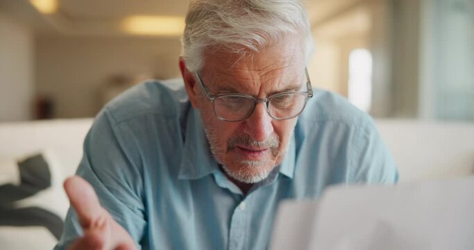 Paperwork, sofa and senior man with stress for loan payment, financial bills and insurance. Elderly person, retirement and frustrated with documents for pension, healthcare debt and invoice at home