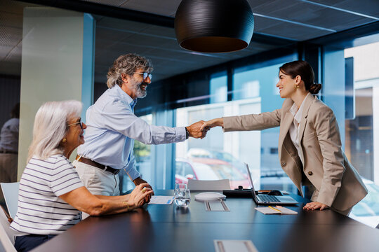 Senior couple shaking hands with financial advisor in meeting