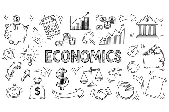 Economics concepts doodle: money, graphs, and financial symbols illustrated