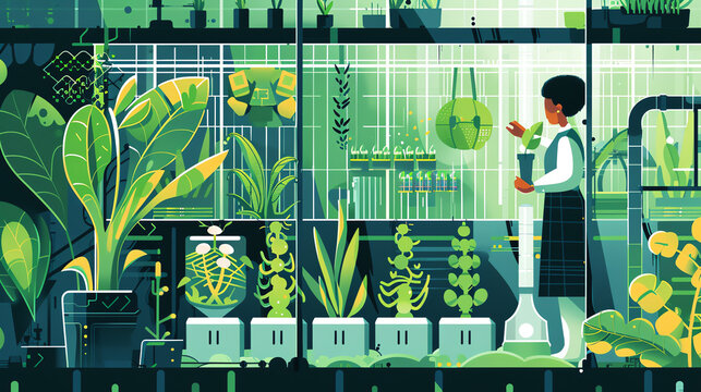 Illustrate a detailed vector graphic showcasing innovative gardening tips for financial sustainability Emphasize futuristic elements for a utopian feel
