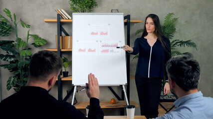 Business man owners asks question teacher study financial literacy listen tutor training in office. Woman coach trainer stands near whiteboard with diagrams teaches listen speaks top managers company