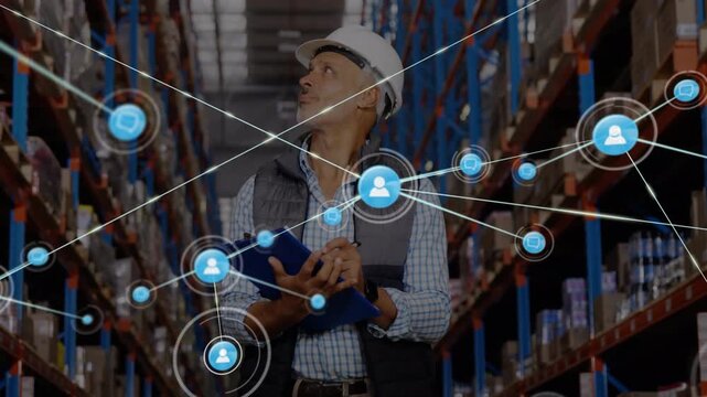 Animation of network of connections with people icons over caucasian man working in warehouse