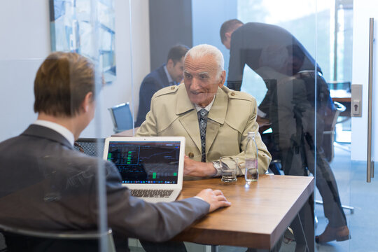 Small business owner and financier at an office, reviewing documents - close-up, serious atmosphere, .