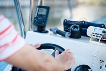 Hands at the steering wheel of a fishing boat with fish finder, GPS , compass and VHF radio