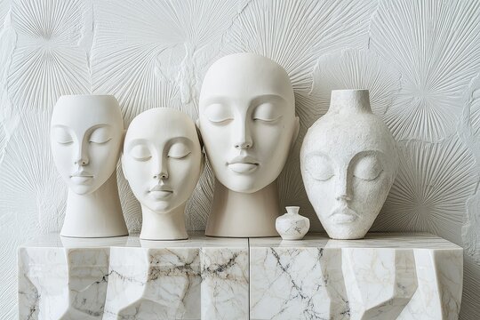 Collection of white ceramic faces and vases on elegant marble chest, with art deco patterns on white wall, photo-realistic product photography style with soft lighting.