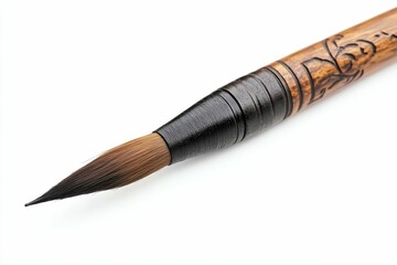 A traditional Japanese calligraphy brush, with polished wooden handle,  resting on canvas surface. Close-up highlighting the details of the fine bristles.