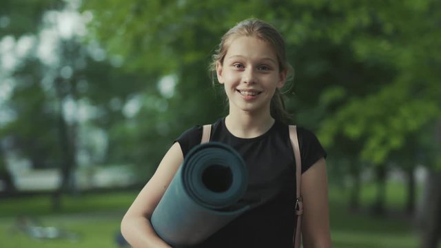 Sweet young Caucasian girl with yoga mat in hands smiling, looking at camera. Portrait of marvelous teenager in sports clothes. Park. Harmonious personality. Outside. Summertime.