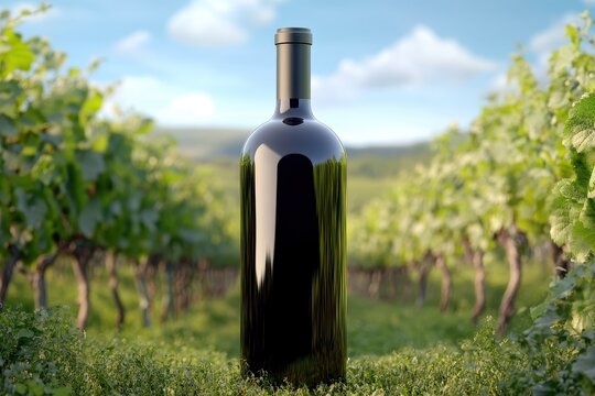 A lonely wine bottle stands amidst lush vineyard, capturing the essence of nature and fine wine production.