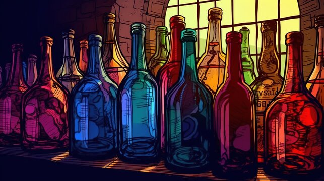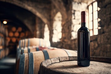 Wine bottle on barrel in cellar with stone arches and stacked barrels.