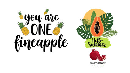 Vibrant summer illustrations showcase tropical fruits and leaves on colorful backgrounds with fun quotes.