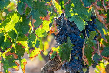 Ripe clusters of grapes under a canopy of leaves in a vineyard, capturing the beauty of nature and the art of viticulture at its finest moment of bounty in Penedes Spain