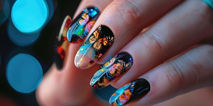 3D nail art of diamond and hologram nail design. Nail design closeup hand art acrylic gel manicure fingernail nail design abstract. Realistic 3D illustration. Generative AI