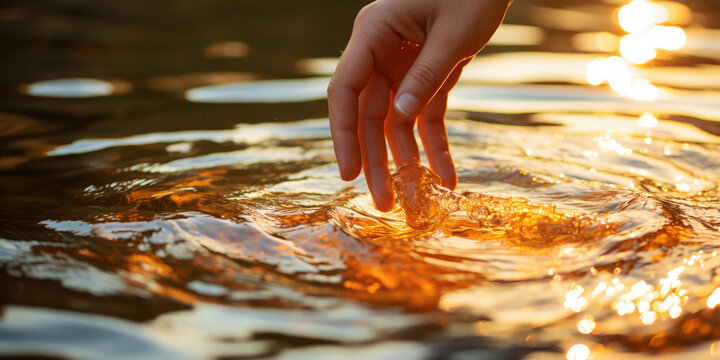 The tranquil act of a finger tracing patterns on the shimmering surface of a gently flowing river