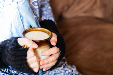 Woman holding warm mug of chai tea in winter