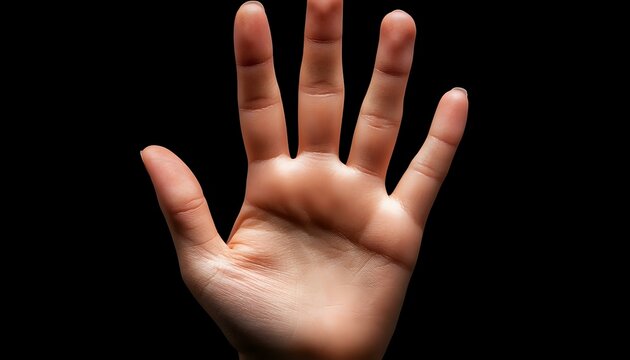 Open palm of light-skinned hand against dark background showing five fingers spread wide, dramatic side lighting creates shadows and depth for conceptual use.