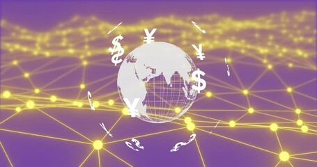 Global currency symbols rotating around Earth animation over network connections