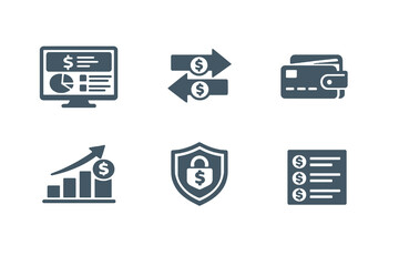 Set of six monochromatic banking and finance icons in flat vector style. Simple symbols designed for fintech apps, online banking platforms and finance dashboards.