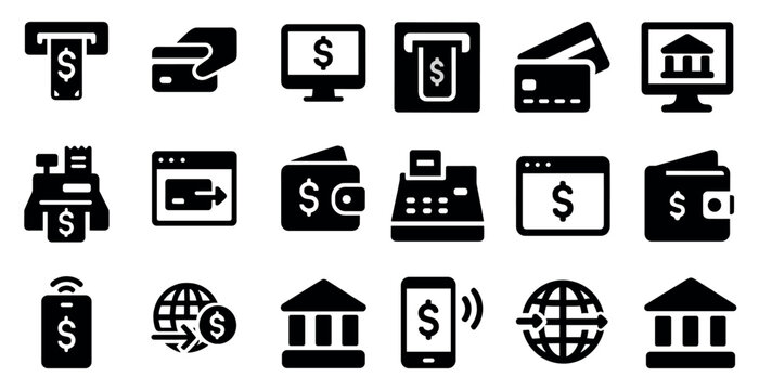Finance and banking solid icons set – filled, transaction, currency symbols
