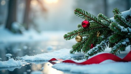 Fir branches adorned with golden red balls and festive ribbon on a frozen lake, firbranch, red, frosty
