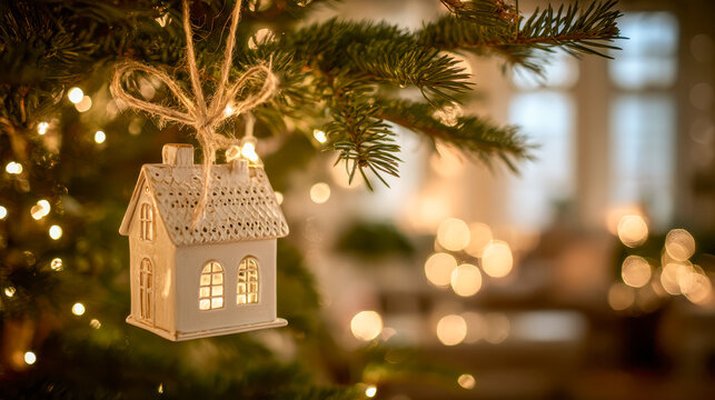 Warm festive holiday atmosphere with illuminated ceramic house decoration hanging on a fir tree surrounded by cozy blurred glowing lights in the background
