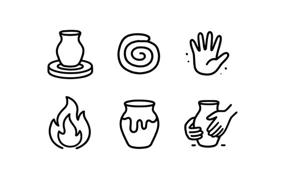 hand drawn cute doodle style line isolated on white background pottery making (symbols): wheel spin clay spiral handprint fire icon drip glaze shaping hands