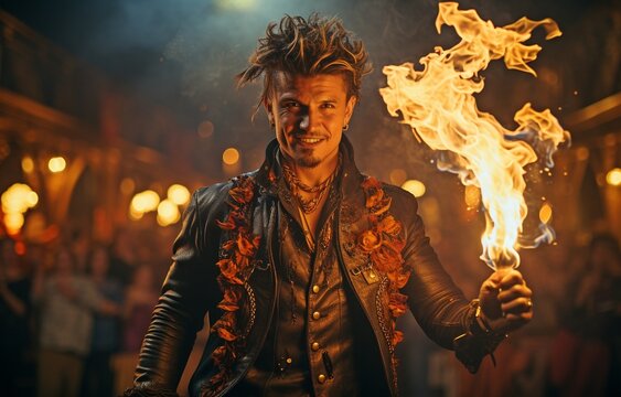 Circus Fire Breather Flame Show. Big Flame Plume.