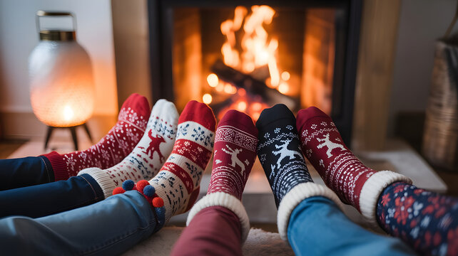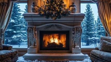 A cozy cabin fireplace glows with warm light, providing warmth and ambiance on a chilly winter day