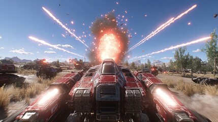 A futuristic tank fires missiles amidst a dramatic explosion in a barren landscape.