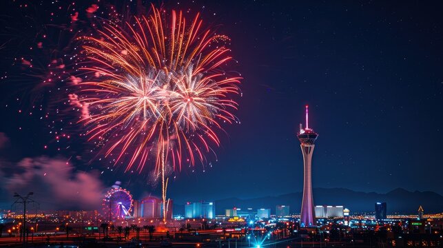 Fireworks explode over Las Vegas Strip at night.  A stunning display of colorful fireworks over the